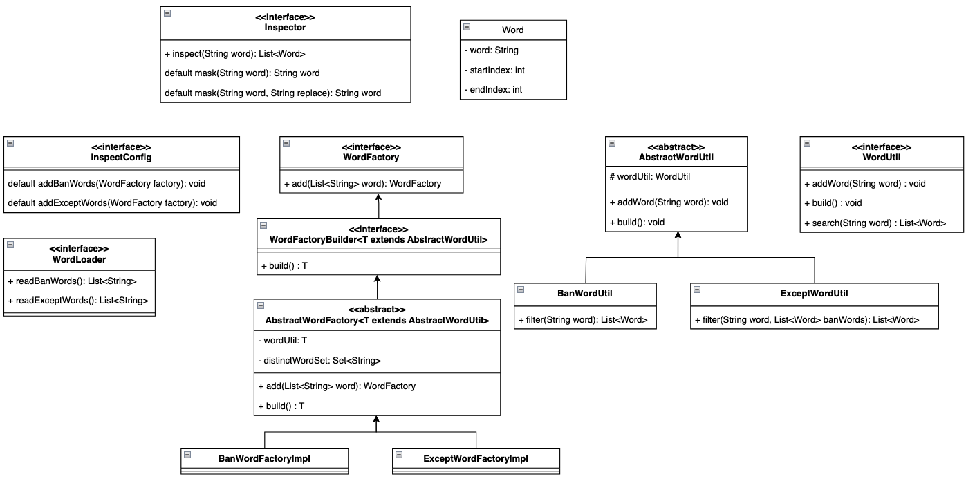 기능분리 위의 자료구조를 보면 - 설정파트를 담당하는 InspectConfig, InnerInspectConfig - JSON을 불러오는 WordLoader - 설정파트에서 데이터를 로드해 Util을 Builder 해주는 WordFactoryBuilder - 금지어, 예외단어를 처리하는 BanWordUtil, ExceptWordUtil - 문자열 처리를 담당하는 WordUtil - 사용자가 사용하는 Inspector 이렇게 나누어져있는걸 볼 수 있습니다. 이런 역할을 분리하고, 인터페이스화, 추상화 단계를 직접 처리하며 기능분리에대한 이해도가 높아진것같습니다.