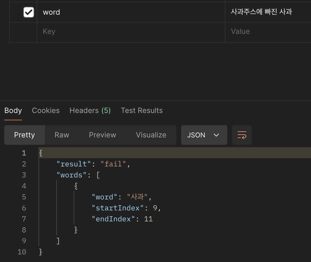 가장 중요한 부분입니다. 바로 문자열 검사에 대한 알고리즘이 들어가는 부분인데요. 처음에 이 부분을 직접 구현해서 사용했었는데, 위의 우아한기술블로그에서 소개한 아호코라식 알고리즘 을 기반으로 커스텀해서 띄어쓰기를 허용한 데이터를 반환하게 구성했습니다.